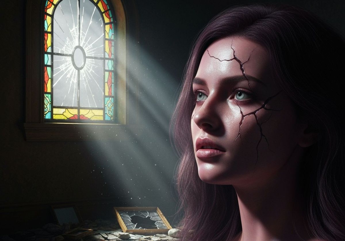 This image features a close-up portrait of a woman with a damaged yet glorious face, depicted in a surreal, matte rainbow painting style with sci-fi elements. Dramatic light illuminates the scene.