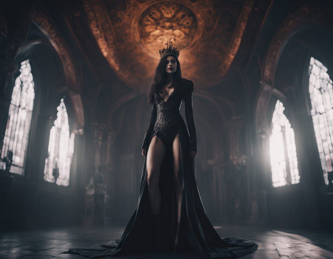 This image shows a dark fantasy queen in a gothic throne room. Bathed in moonlight and torchlight, she wears a crimson gown and a cursed ruby crown in this cinematic, photorealistic image.