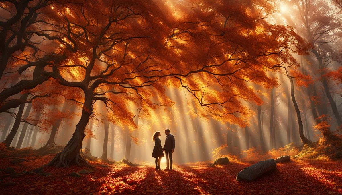 This image shows a hyperrealistic 3D rendering of a couple embracing amidst a vibrant autumn forest. The scene is bathed in the warm light of golden hour, with intricate details and dramatic, cinematic atmosphere.