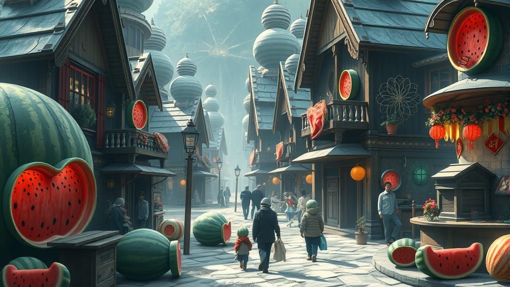 Create intricate watermelon village scenes with our free AI image generator, featuring detailed wireworm inhabitants.