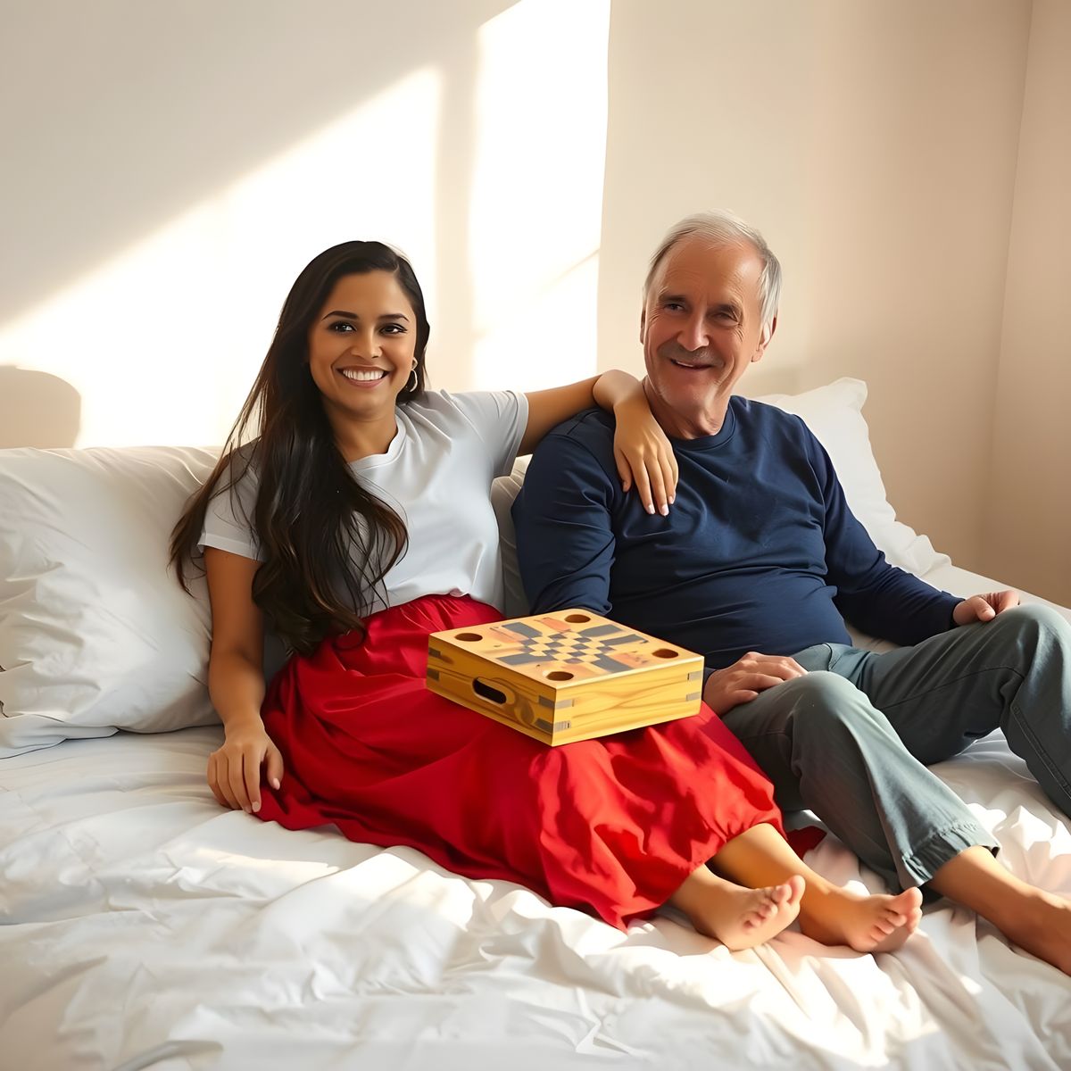 A contemporary portrait of a loving couple in their mid-40s to 50s, seated casually on a white bed with natural lighting. The woman, of South Asian or Latin American descent, has long brown hair and a relaxed pose, while the man has gray hair and a gentle smile. The warm and intimate atmosphere is captur...