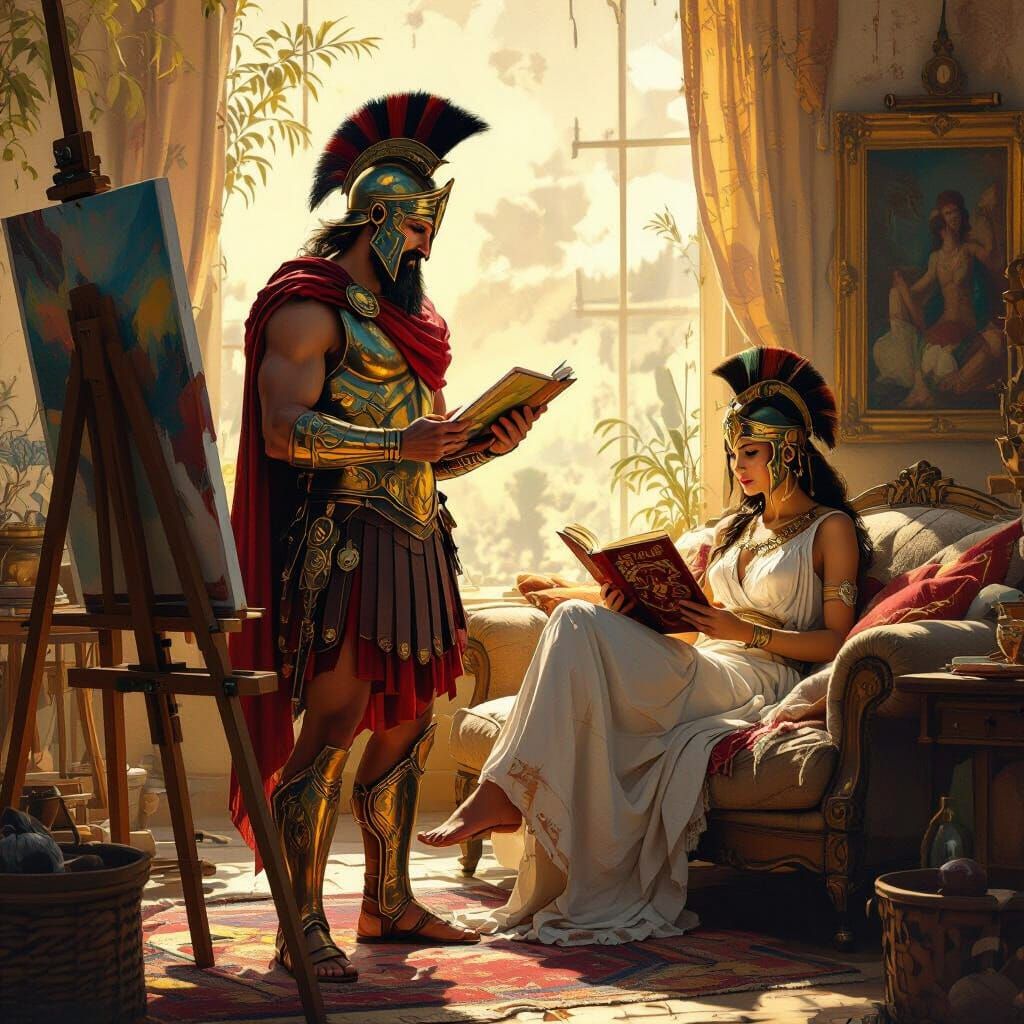Ares, the god of war, is reimagined as a painter in his sunlit studio, capturing Athena in a moment of repose. The artwork features rich textures and complementary colors in a detailed matte painting style.