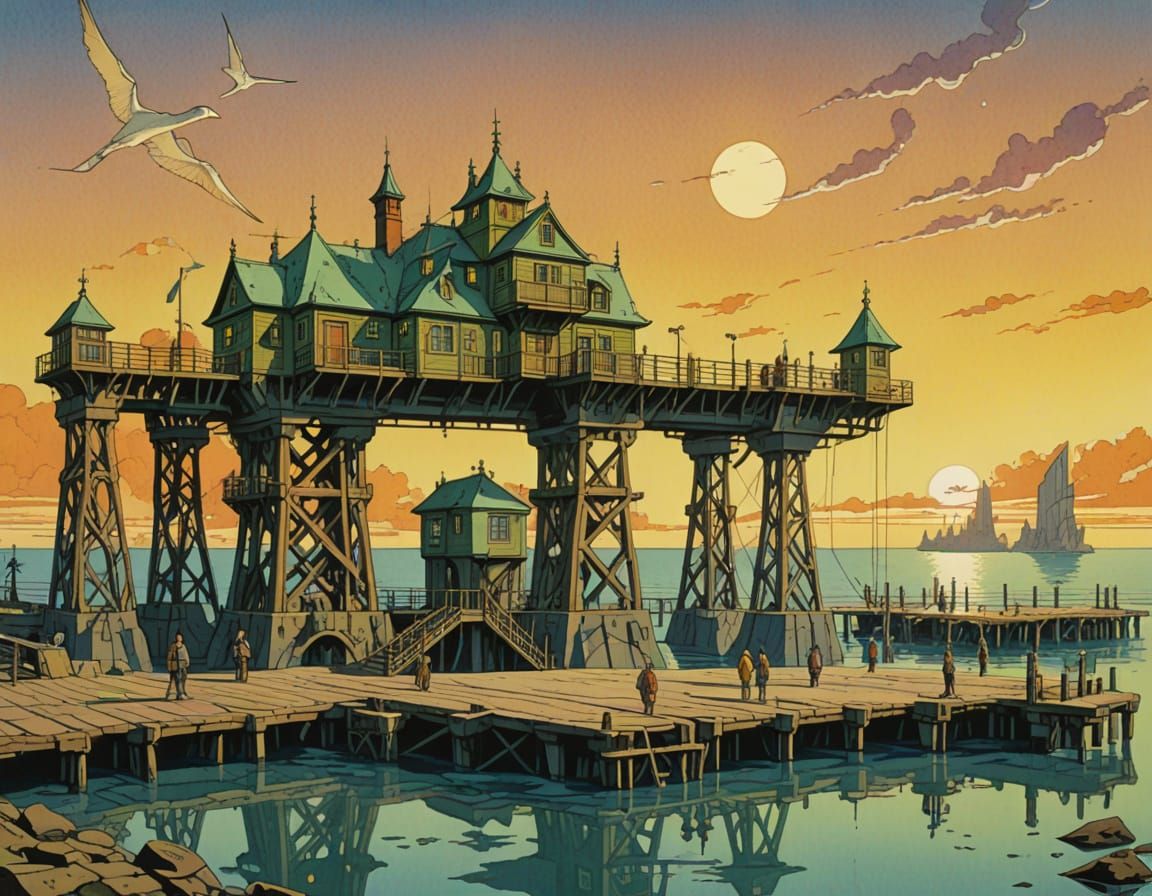 A scenic watercolor painting of an old pier in daylight. The mixed media style image uses gouache, soft pastel indigo blue, dreamy mossy green textures, and warm sunburst yellow-orange hues with bright volumetric lighting.