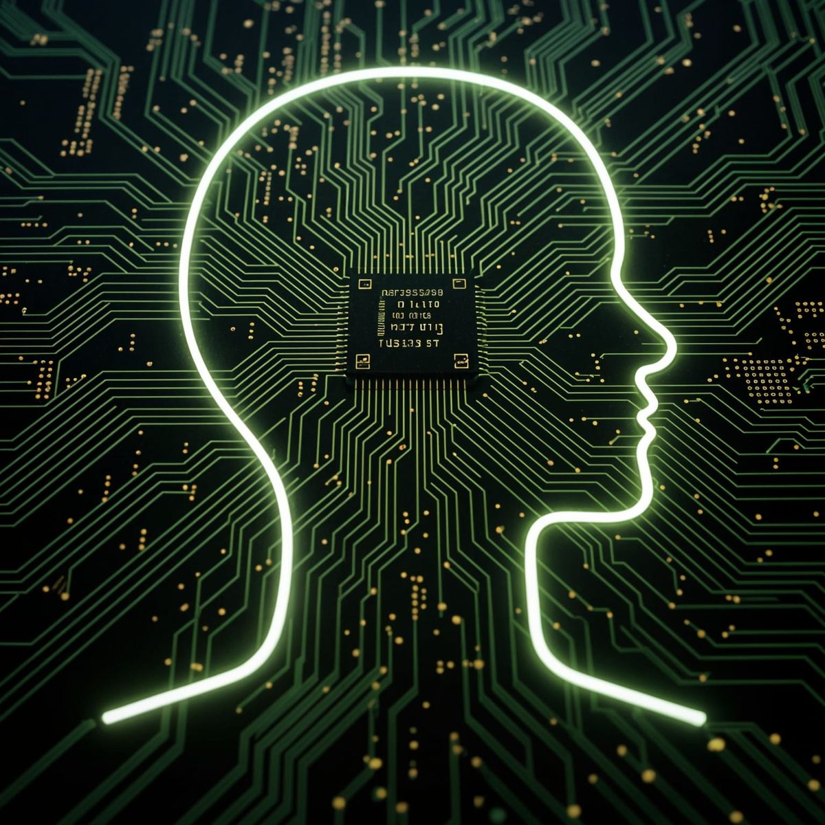 This digital art features a human silhouette formed from intricate green circuitry with a metallic border, glowing signal lines, and sci-fi concept art influences.