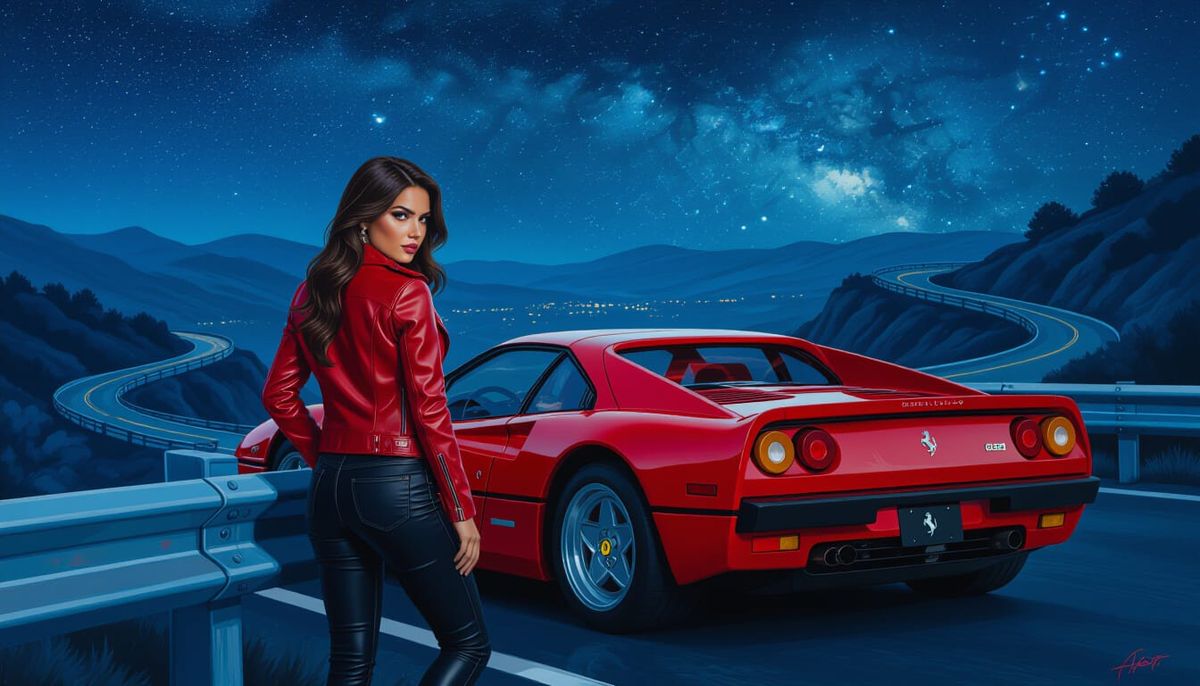 This atmospheric painting depicts a woman in leather next to a classic Ferrari, overlooking a valley at night. Rendered in a textured, impasto style with dramatic light and shadow, evoking a sense of mystery.