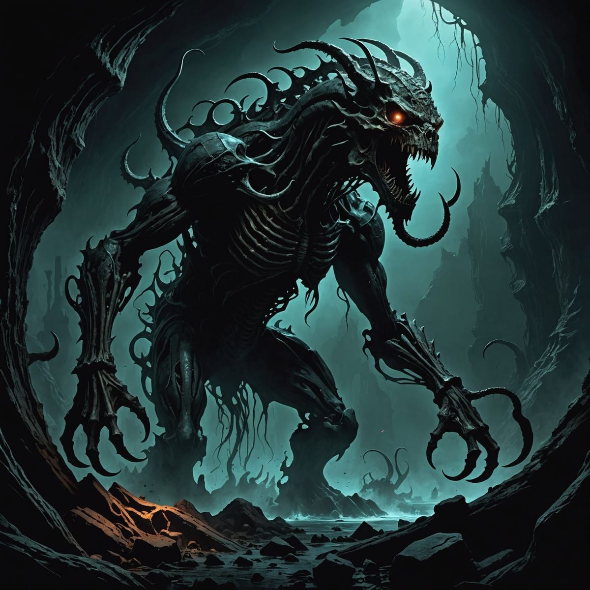 A dark art image depicting a Lovecraftian beast silhouetted against a deep abyss. High contrast lighting and shadow play enhance the oppressive and dread-filled atmosphere in this digital painting.