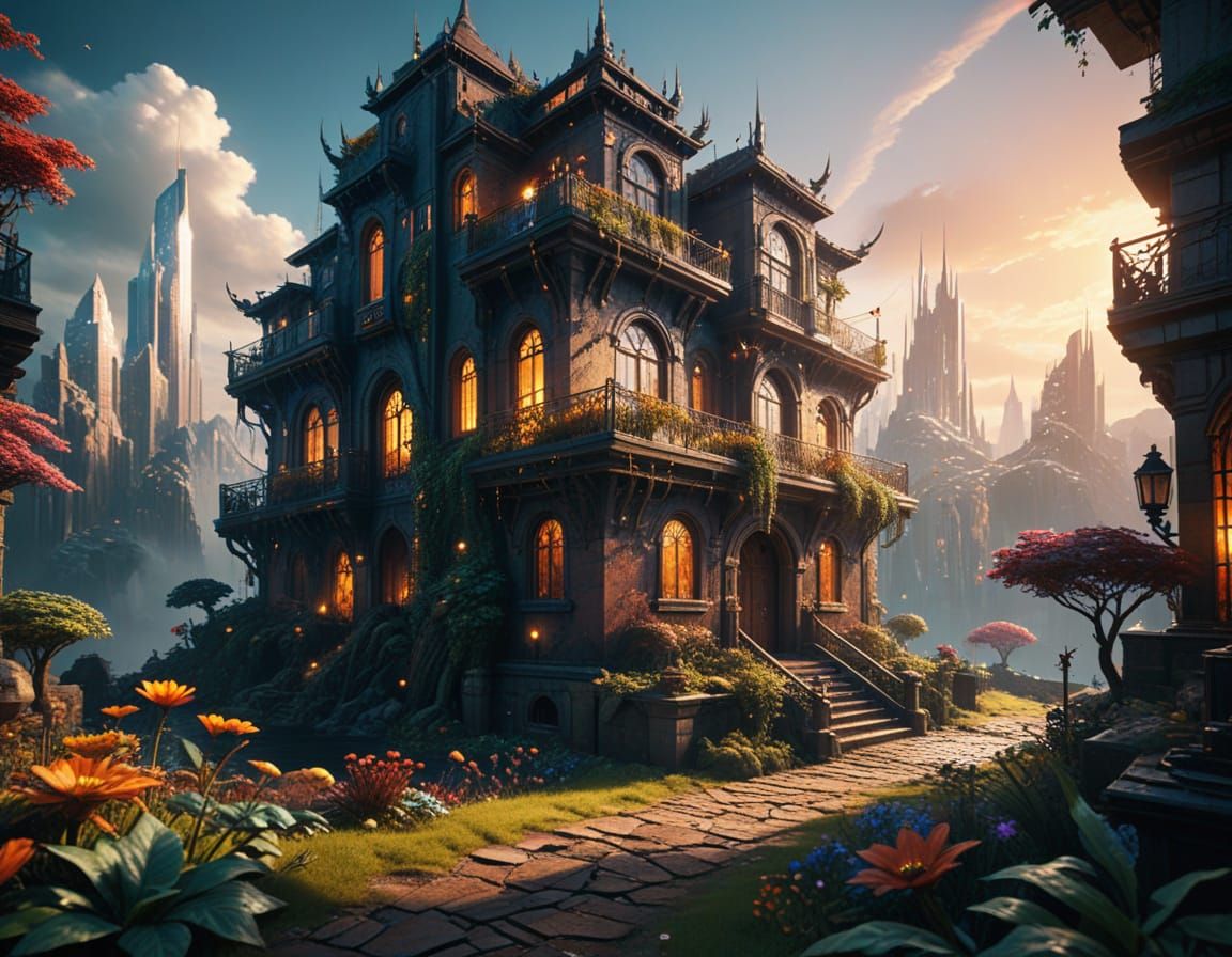 This image showcases a futuristic cityscape in a solar punk utopia, blending fantasy and science fiction elements with intricate details and vibrant colors, reminiscent of a maximalist digital art piece.