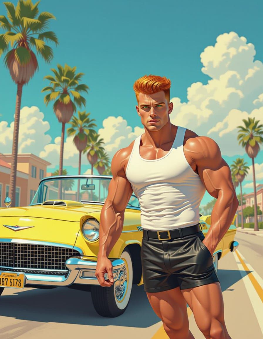 A striking picture of a muscular, ginger-haired man in retro synthwave style. The subject is leaning against a vintage yellow convertible under a vivid blue sky with pastel pink clouds, in a vaporwave aesthetic.