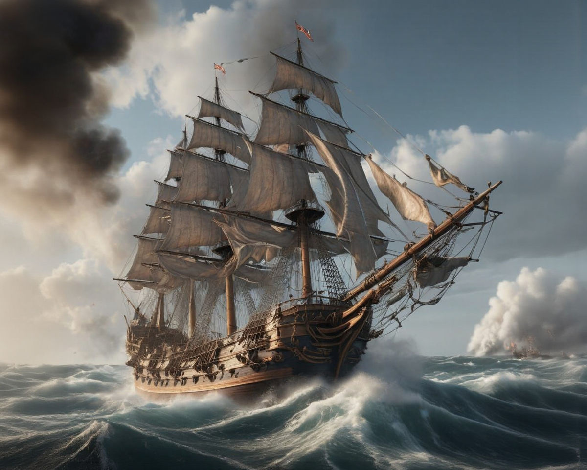 This image shows a galleon ship engaged in naval combat, with cannons firing and smoke billowing. The scene features dramatic ocean waves and detailed sails, captured with intense lighting.