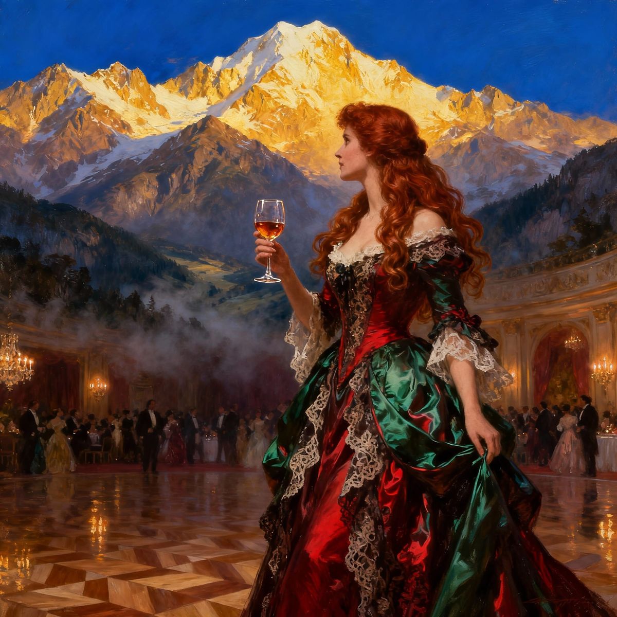 This hyperrealistic oil painting captures an elegant woman in a French-style dress, enjoying wine with a backdrop of majestic mountains, rendered with dramatic flair.