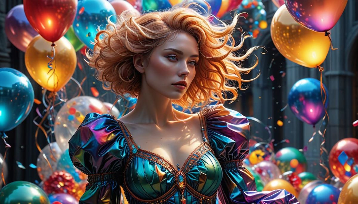 A captivating image of a woman composed of stained glass emerging from balloons on a stormy sea. Escher-esque houses loom in the background, with resin wire art and optical illusions in a surreal aesthetic.