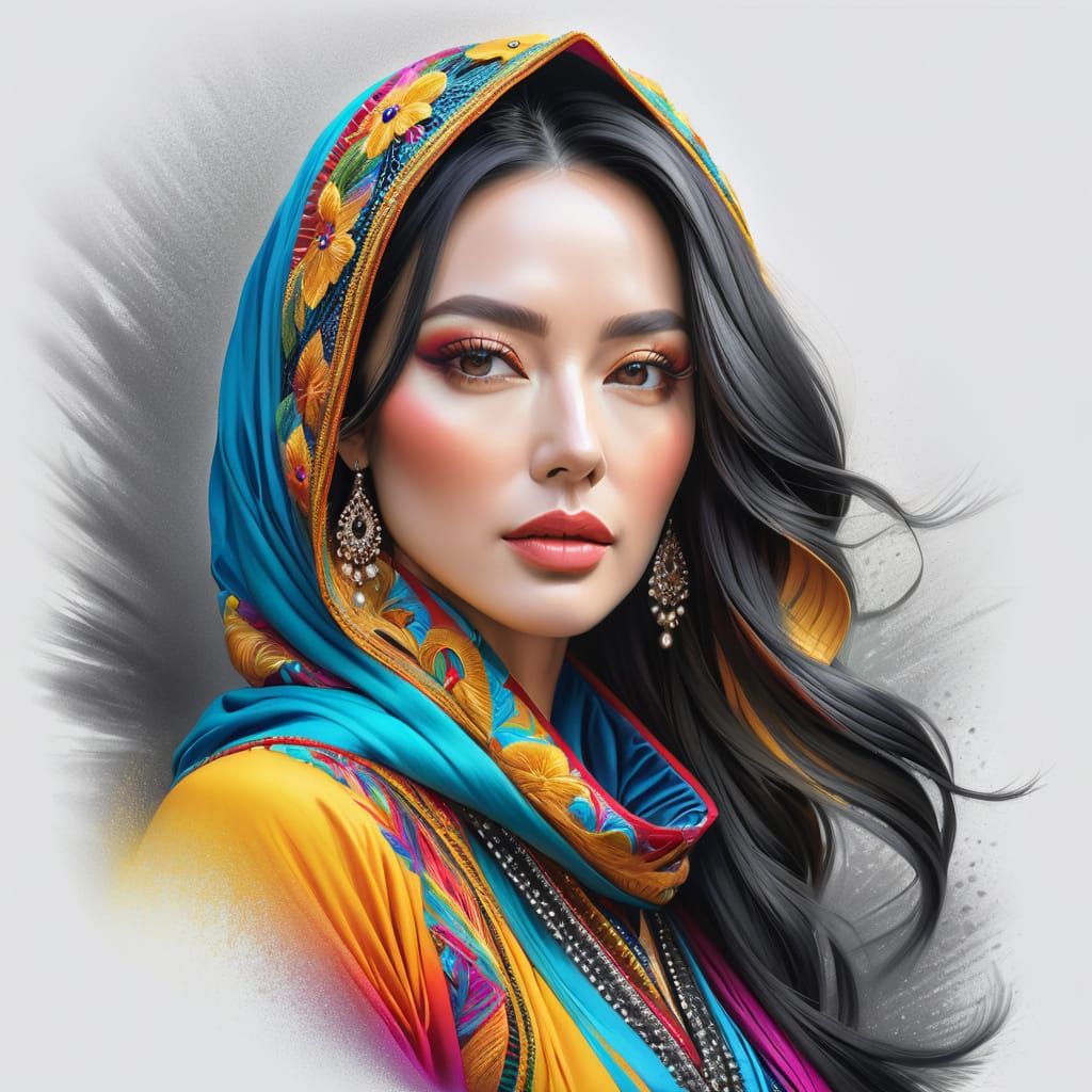 A mid-shot hyperrealistic portrait of a beautiful woman adorned in intricate, colorful attire. The artwork features dramatic lighting and a vibrant background, rendered with exceptional detail.