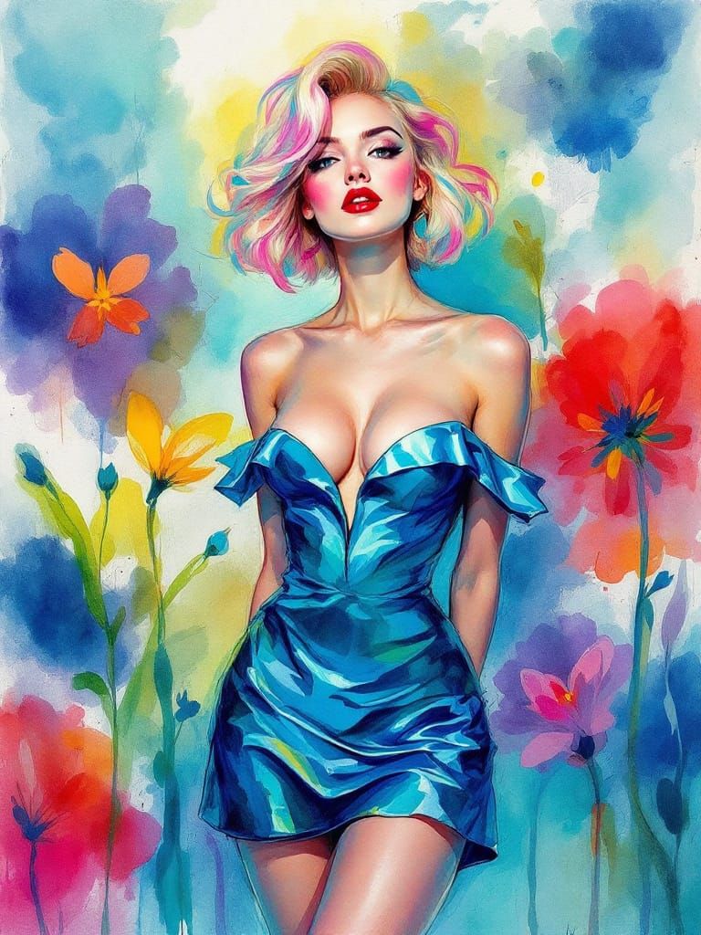 This image features a full-body portrait of a blond woman with pink-tipped hair, wearing a metallic cyan dress. It showcases vibrant watercolor blooms with gestural ink lines, evoking a Fauvist style with bold color and spontaneous brushstrokes.