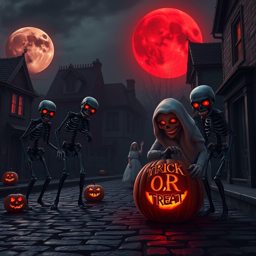 Ilustración digital oscura de Halloween que muestra tres criaturas esqueléticas (zombis/demonios) y una niña fantasmal con ojos rojos en una calle adoquinada, bajo una luna roja. El fondo presenta casas viejas y calabazas talladas con la frase "TRICK OR TREAT".