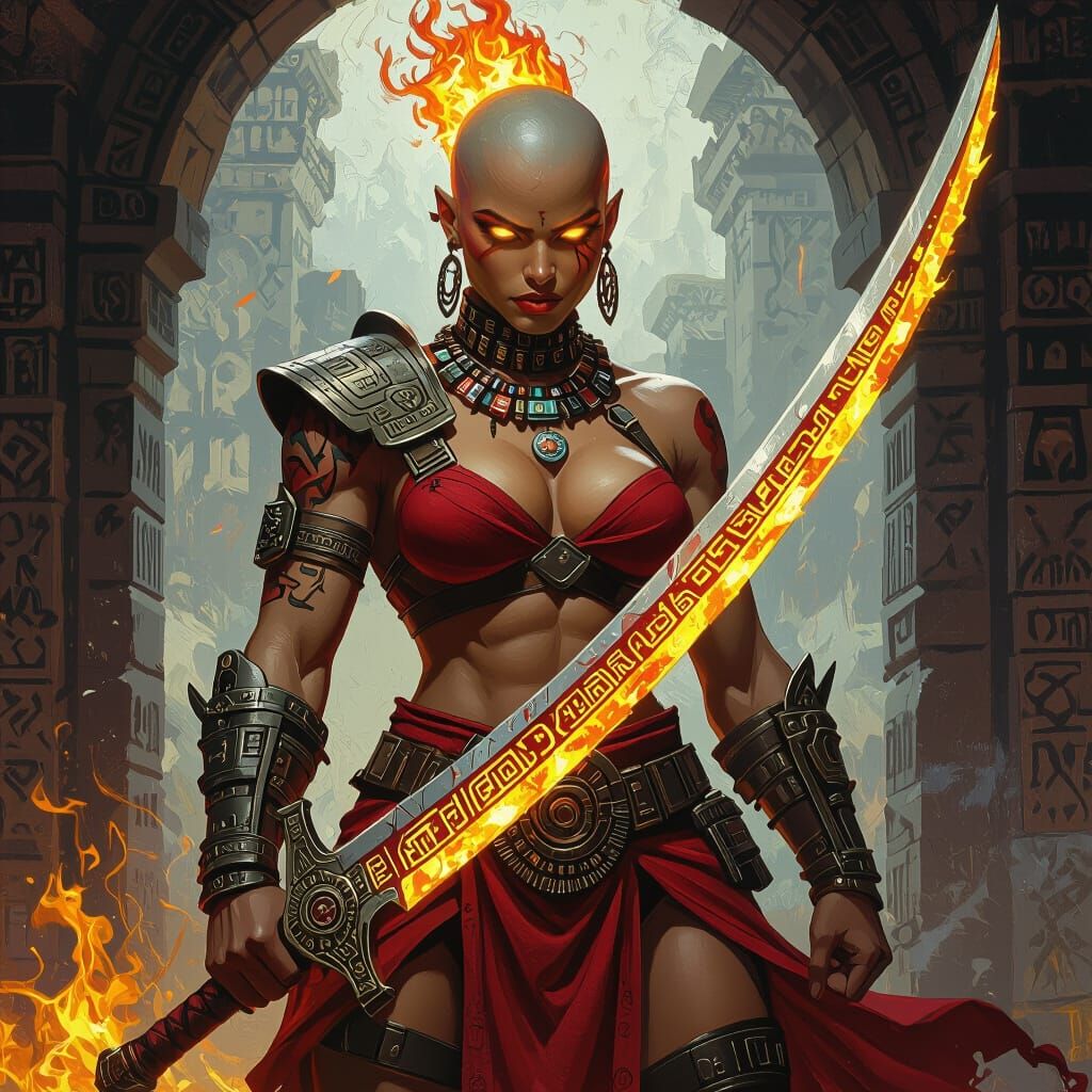 This image shows a powerful fire genasi barbarian woman with flaming hair and glowing eyes, wielding an Aztec sword in a dark fantasy world. The artwork features dynamic lighting and hyperdetailed textures with a stylized oil paint aesthetic.