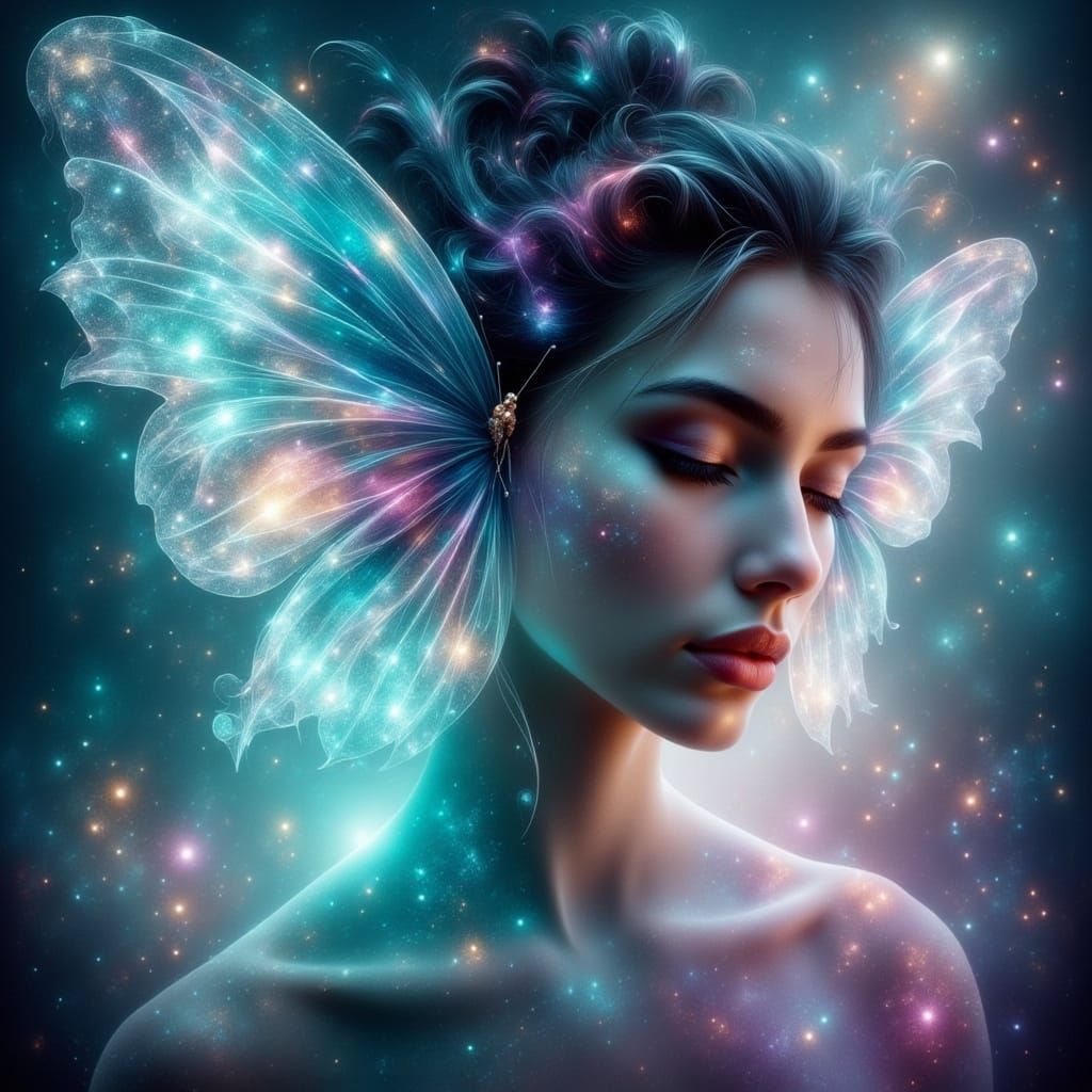 A surreal portrait of a woman with butterfly wings. The image features soft, glowing edges and a dreamy, ethereal aura with vivid gradient colors in a fantasy art style.