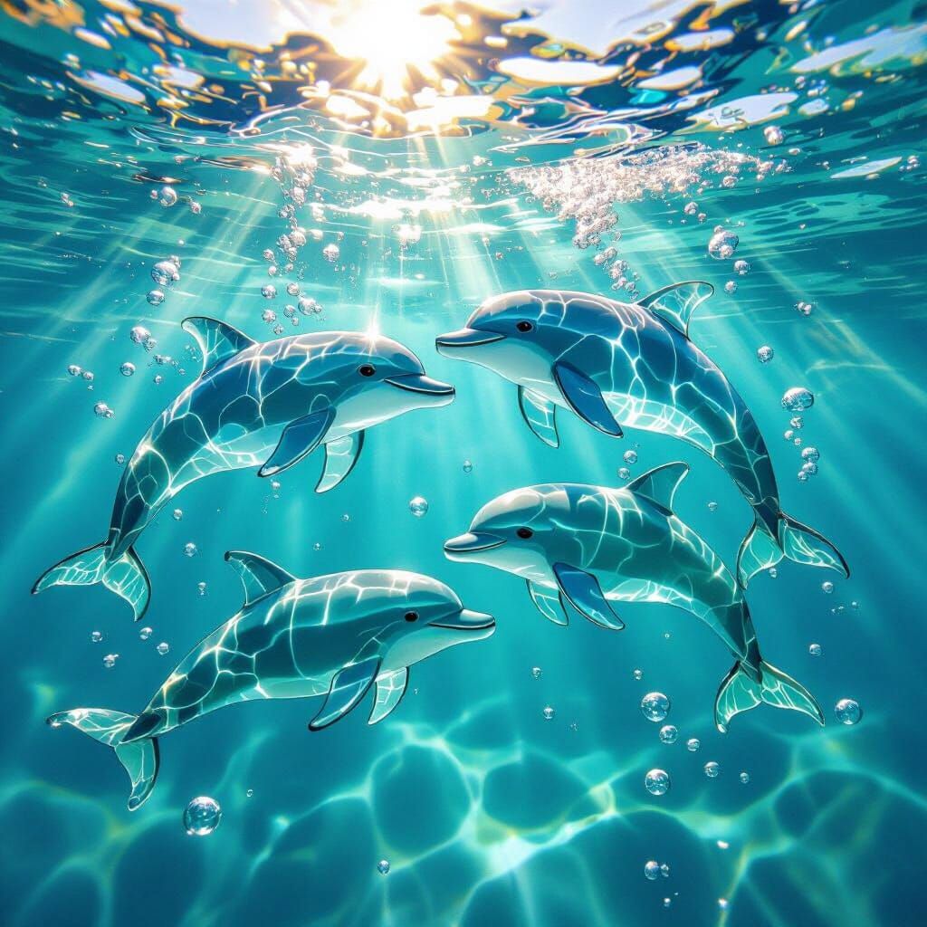 This image features a whimsical sea glass sculpture depicting a dolphin family swimming joyfully beneath turquoise ocean waves. Sunlight filters through, highlighting their smooth forms and playful bubbles in vibrant, jewel-toned hues.