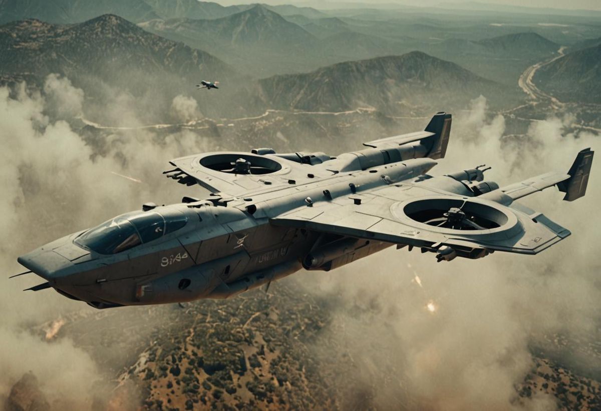 This image shows an advanced airborne VTOL drone carrier designed for the US Air Force. The digital artwork features cinematic lighting and post-processing, creating an atmospheric and dramatic scene.