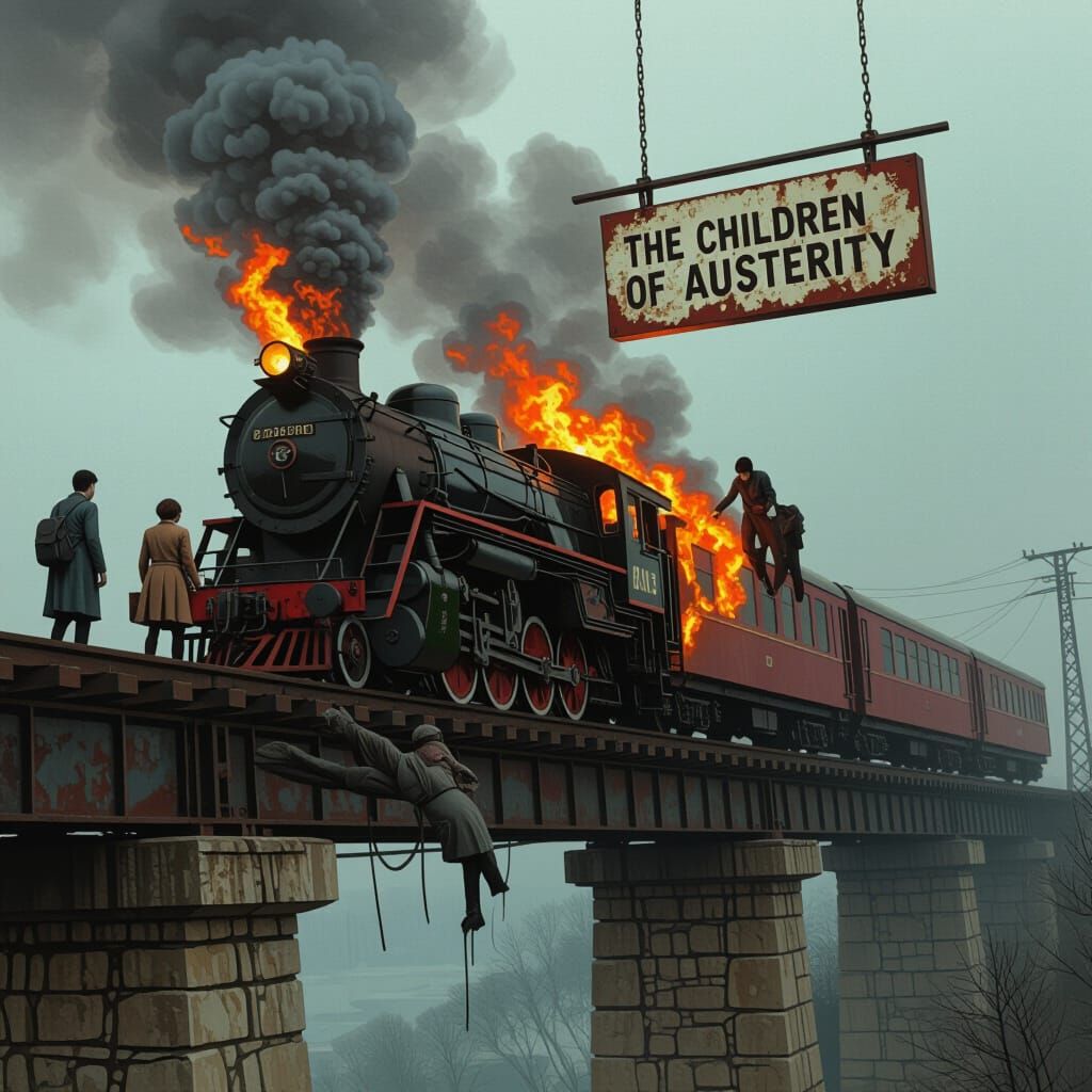 This image shows a flaming passenger train falling from a collapsing viaduct. Passengers in tattered clothing are visible in this dark, gritty, dystopian scene, rendered as if influenced by surrealist and dark futuristic art.