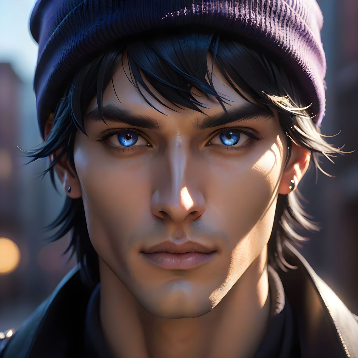 A handsome man with luminous skin, radiant in the sunlight, adorned with shiny, raven-black hair tucked under a sleek black beanie, except for a single, swooping fringe that dramatically falls over his right cheek, nearly veiling his eye. High cheekbones, full, plump lips, and piercing dark blue eyes ...
