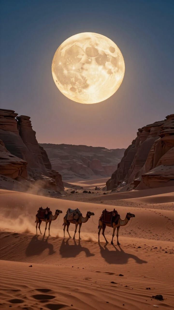 This hyper-realistic image depicts a colossal, luminous moon ascending over an ancient desert canyon. A Bedouin caravan travels across red dunes under cinematic moonlight and fading sunset hues, creating a scene of quiet wonder.