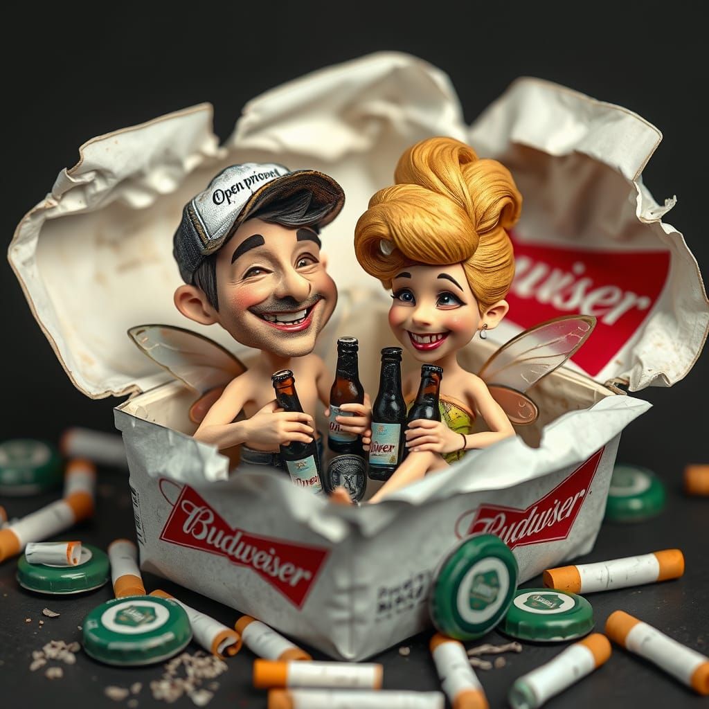This image features a miniature fairy couple living in a Budweiser carton, depicted with humor and vibrant colors. The art style uses bold lines and exaggerated features.