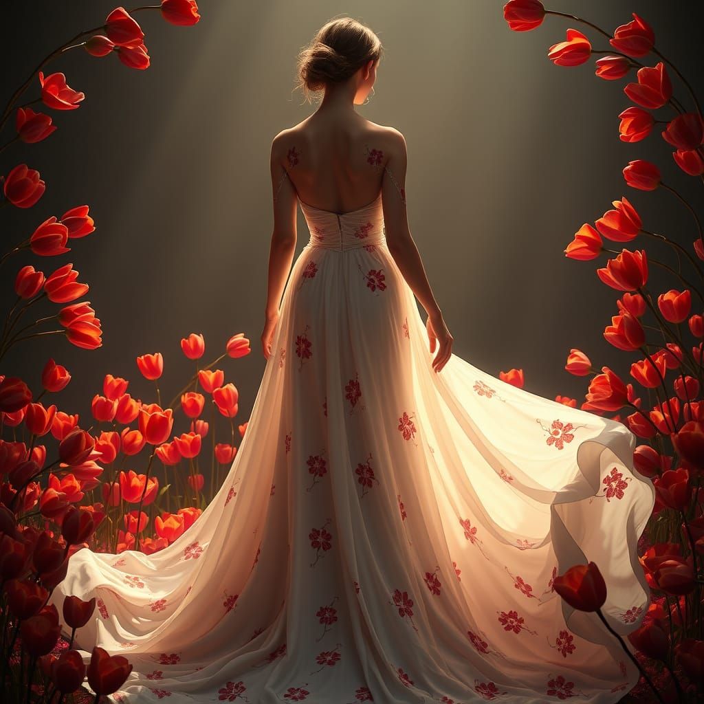 A beautiful elegant woman in a flowing white dress at the base of the dress has red colored flower ends with wide long charm that descends from so long on the floor forming semi-circle flowing in motion ,the woman stands with her back to the viewer, surrounded by a vibrant arrangement of red tulips. ...