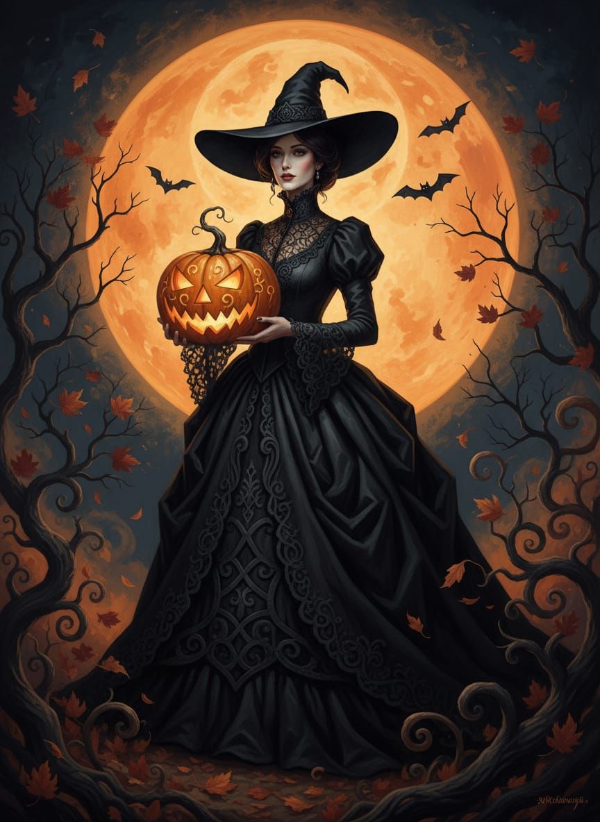 This image depicts an elegant witch in a Victorian gown and hat, holding a glowing Jack-o'-lantern under a luminous full moon. The scene evokes classic Halloween gothic charm with rich textures and moody colors, reminiscent of vintage gothic illustrations.