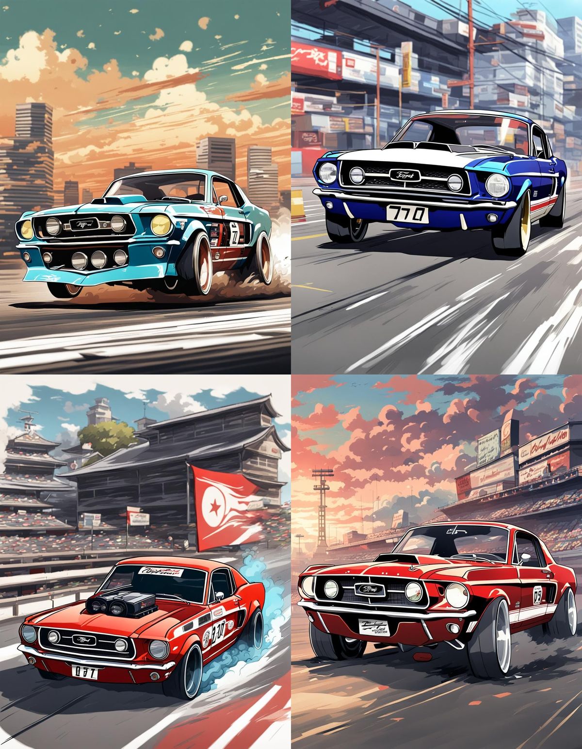 This image shows a 1967 Ford Mustang GT drifting, depicted in a vibrant anime style. The illustration captures the essence of speed and motion with artistic flair.