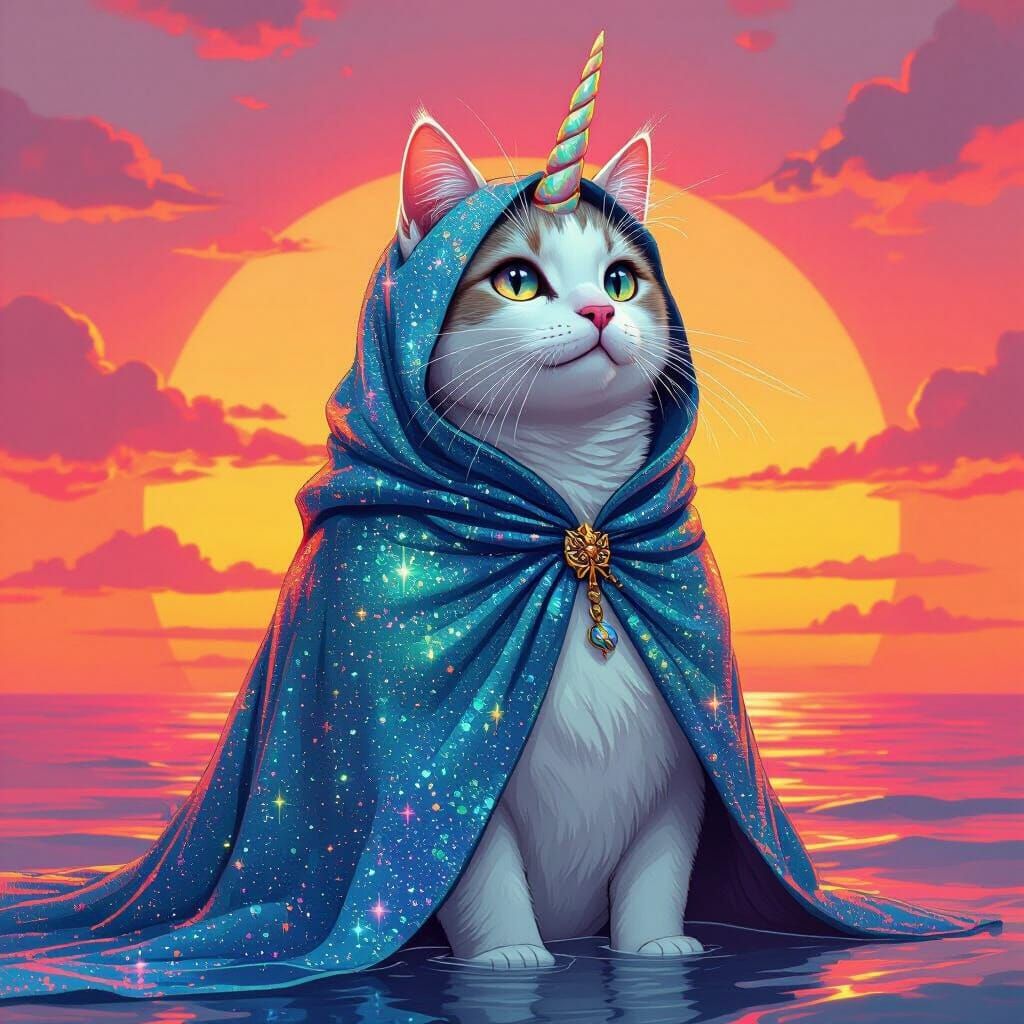 A whimsical hybrid creature blending unicorn, cat, and seal, cloaked in shimmering fabric, stands before a vivid sunset. The artwork features intricate textures and atmospheric lighting.