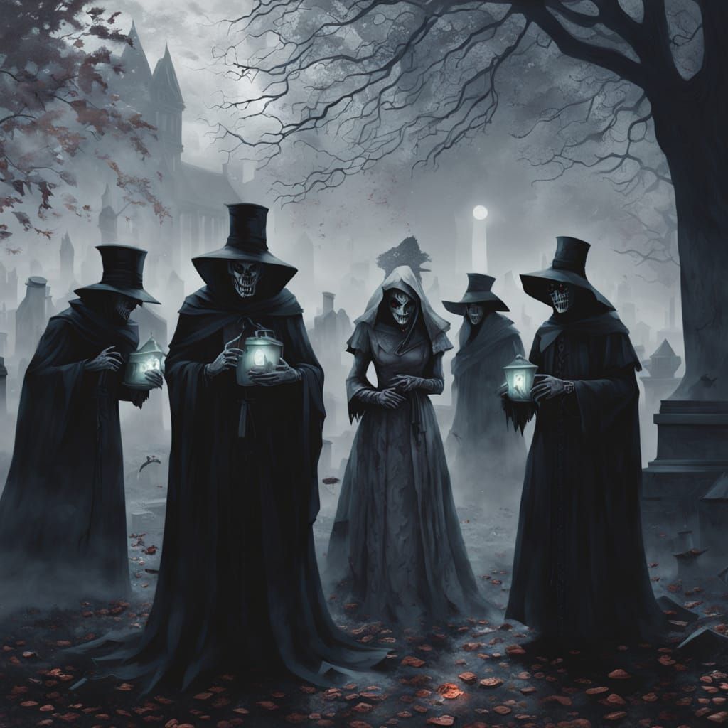 A group of teenagers, dressed in more elaborate, realistic horror costumes, (werewolf, zombie bride, plague doctor)gather in an old, fog-shrouded cemetery. They are sharing a bag of "treats". Gravestones lean at precarious angles, and faint, translucent figures can be seen drifting between the mausoleums.