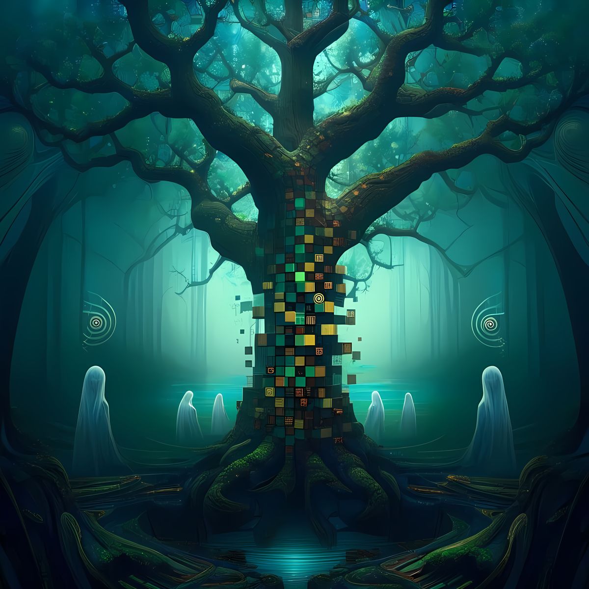 This image shows a massive oak in a labyrinthine forest, with a whimsical interior featuring optical illusions and abstract forms. Humanoid figures emerge from the tree in a surreal scene of organic elegance.
