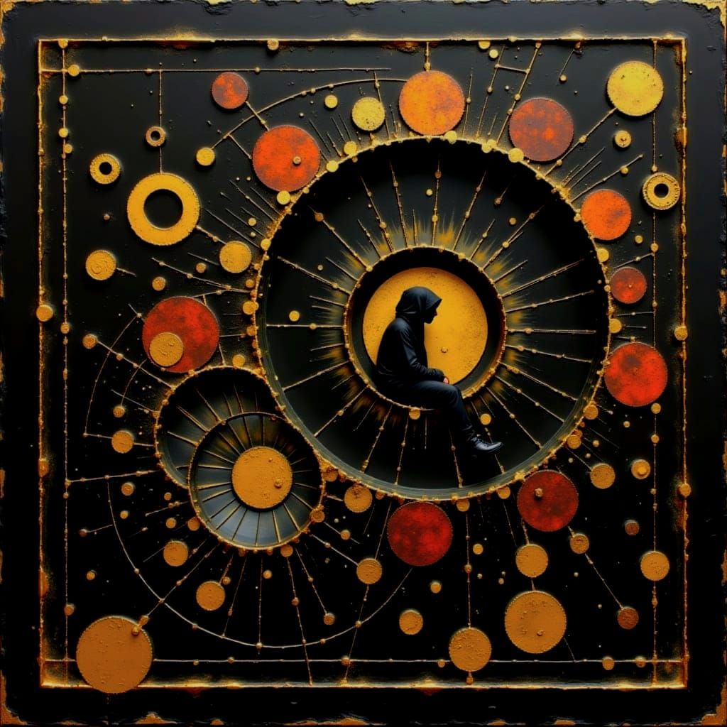 This image displays a complex arrangement of abstract curves and geometric shapes rendered in a dark oil paint aesthetic, evoking a sense of intricate mathematical beauty.
