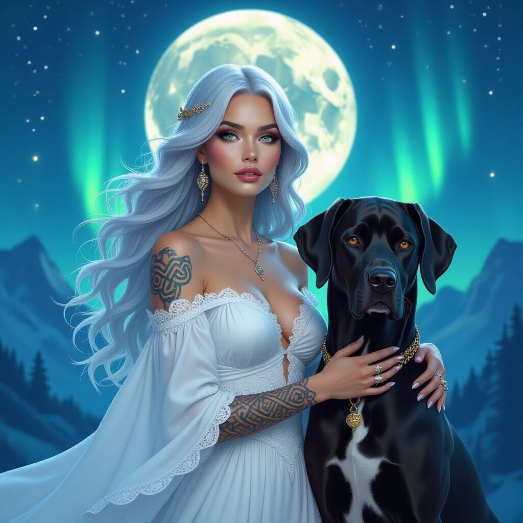 This image shows a pale woman with grey hair and a Celtic tattoo standing with a Great Dane under the Northern Lights. The digital art style evokes a mystical, intricate aesthetic.