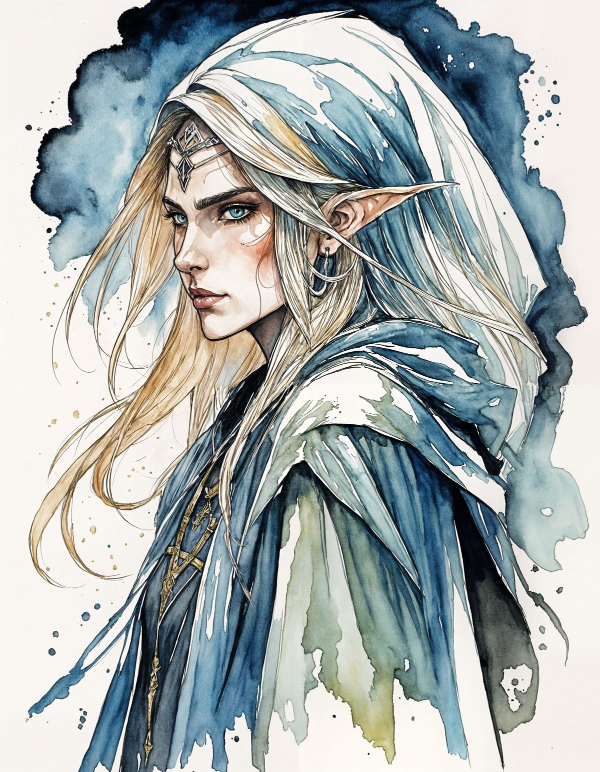 This image shows a majestic Elf sorceress in a dramatic backview, embodying the essence of Lodoss War's fantastical realm, as depicted in a striking ink and watercolor style.