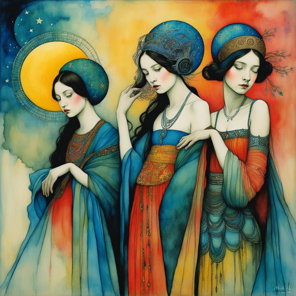 This image shows a delicate watercolor princess in the style of ink and brush art. The artwork evokes a hyperdetailed, dreamlike scene inspired by Mount Olympus.