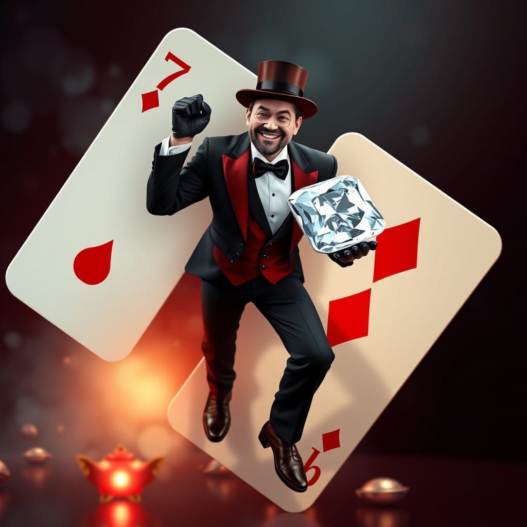 A detailed matte painting of a smiling man in a tuxedo and fedora emerging from a seven of diamonds card, holding a large diamond. Rendered with fantastical elements and deep colors.