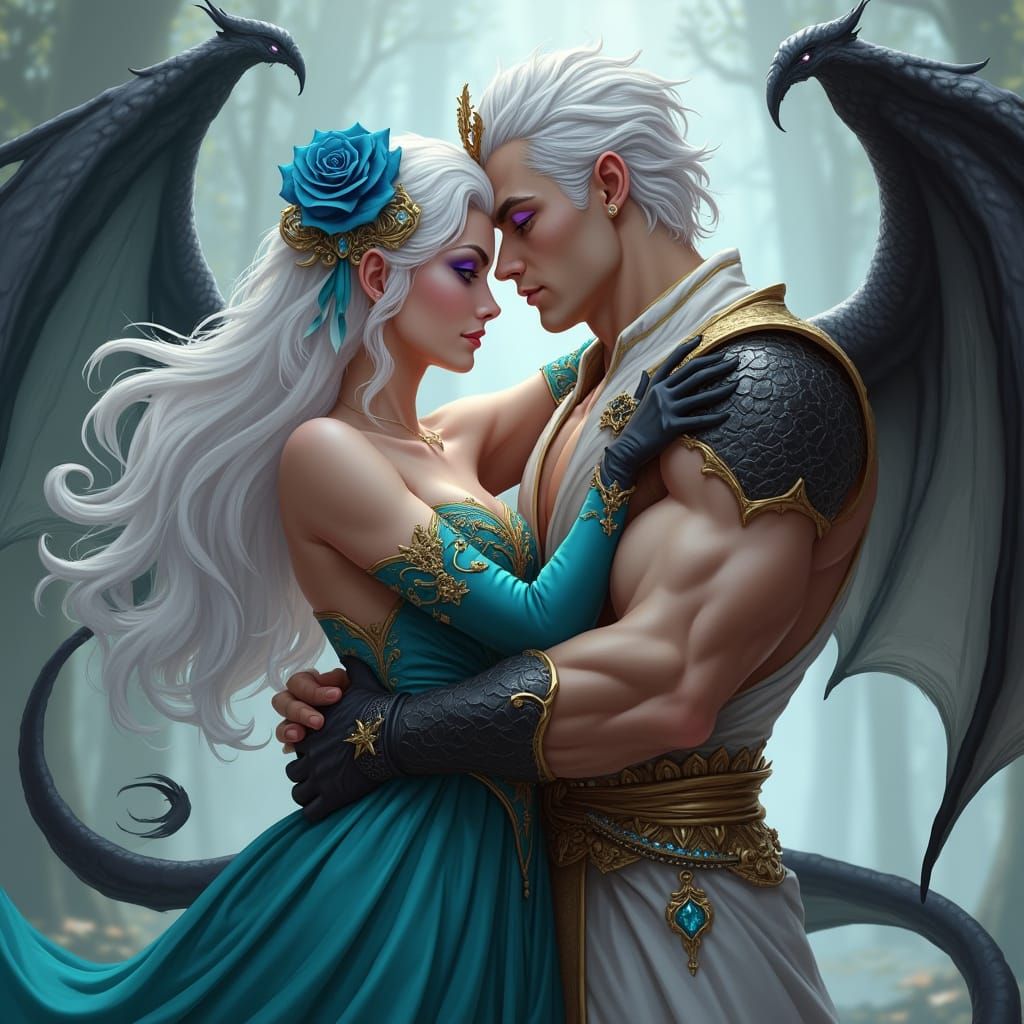 A stunning hyperrealistic portrait of a dragon-woman embracing a warrior, set against a backdrop of fantasy concept art, with intricate details and deep colors reminiscent of 8k resolution Artstation trends and Unreal Engine 5 graphics.