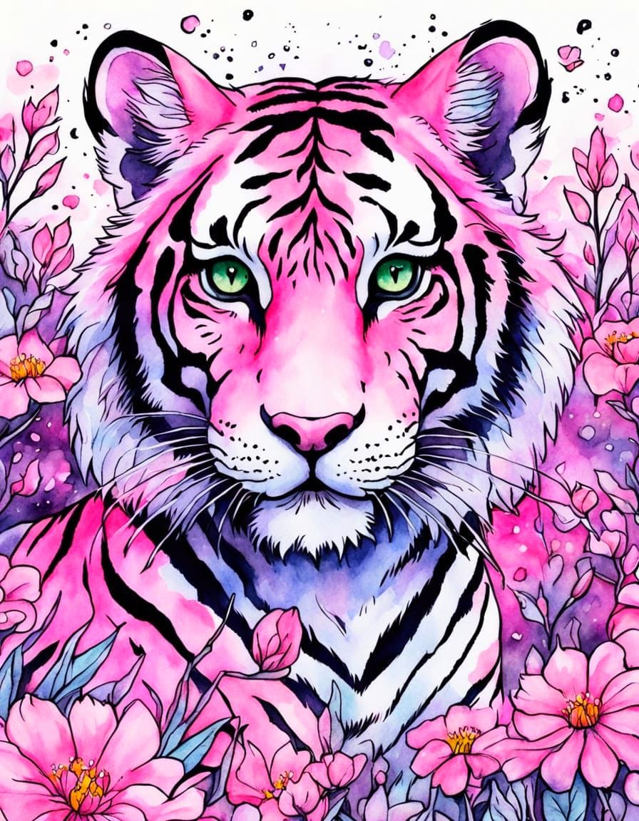 This image shows a pink anime tiger amid pink flowers. The imaginative watercolor and ink painting features ornate details, elaborate lineart, highly saturated colors, and a fantasy aesthetic.