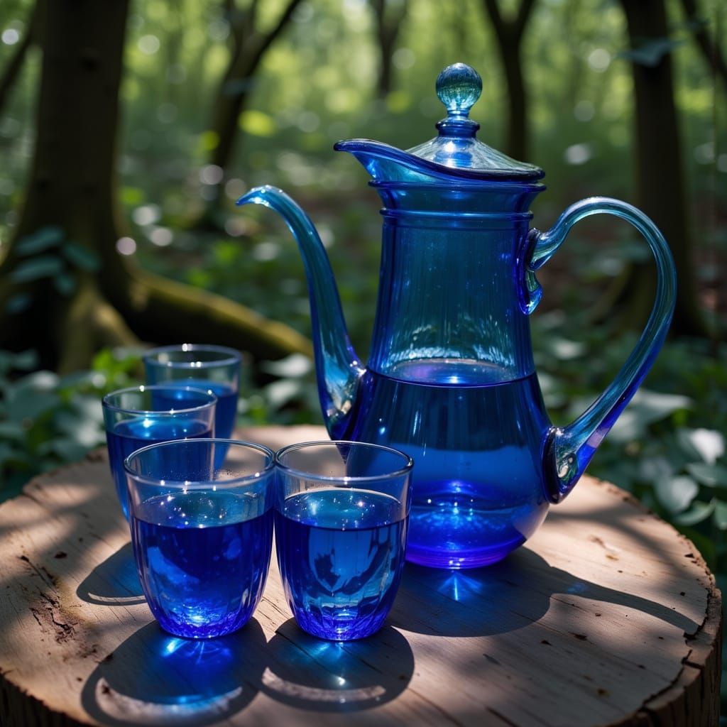 This image showcases a cobalt blue glass teapot and cups filled with tea on a wooden table in a grove. Volumetric lighting and contrasting colors create an ethereal atmosphere, inspired by Cubist still-life artists.