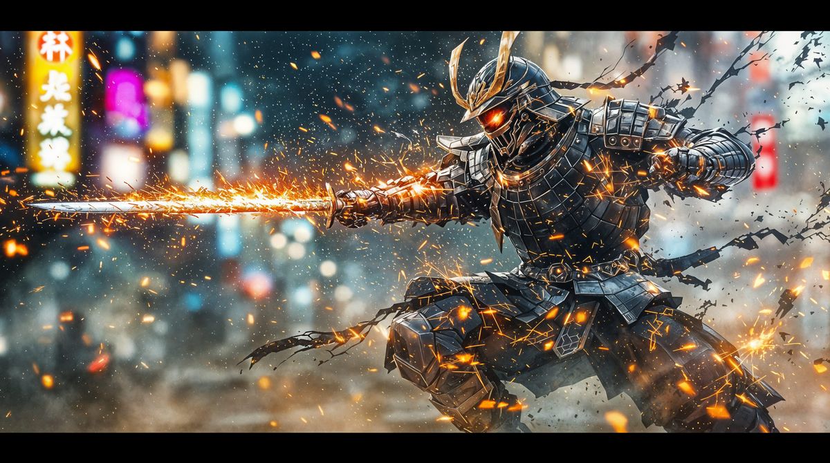 This painting captures a dynamic warrior in mid-air attack, surrounded by vibrant city lights that blend seamlessly into their armor. The expressive oil brushwork creates a textured, dreamy atmosphere with visible brushstrokes and soft haze.