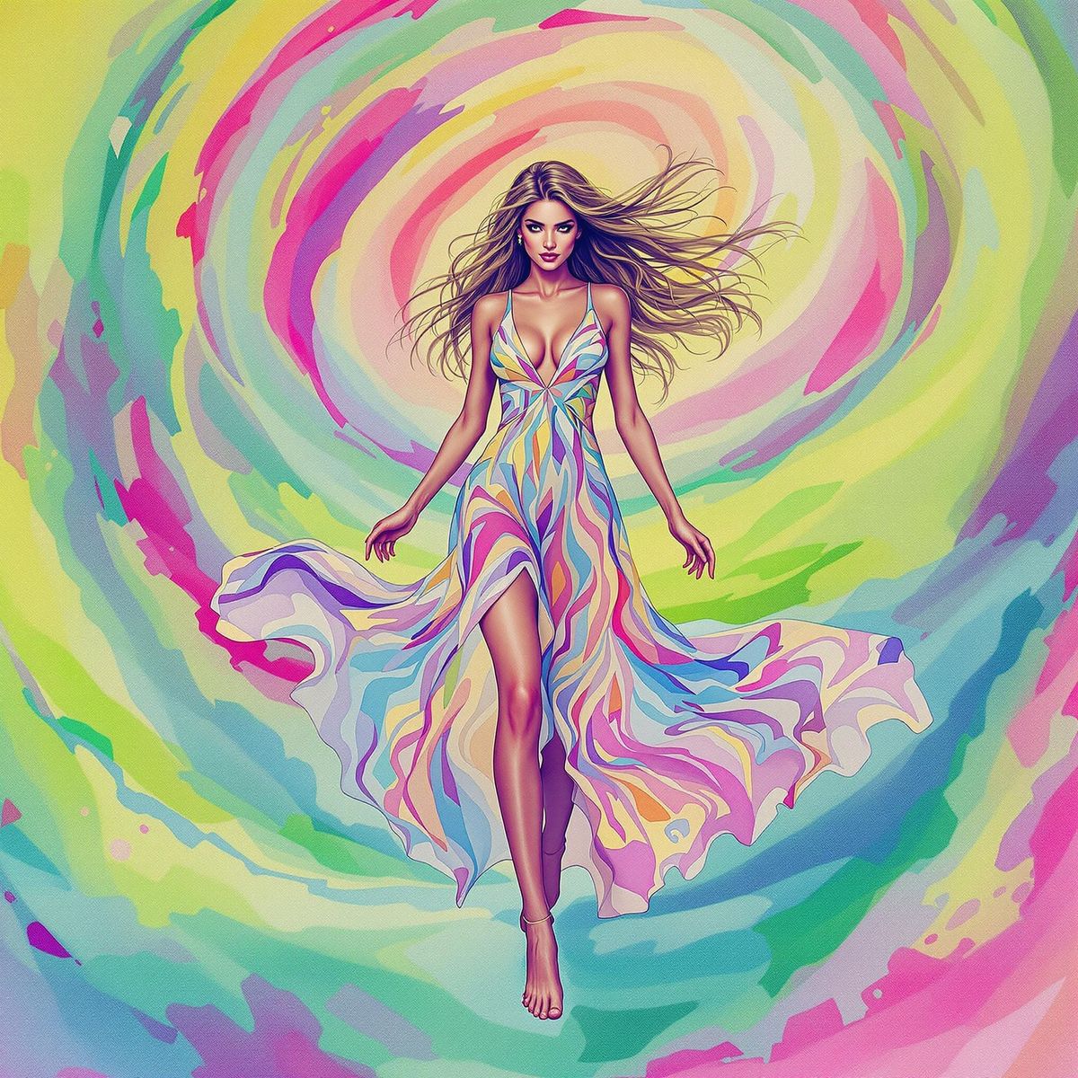 This image shows a barefoot woman in a flowing dress with long, waving hair, rendered in watercolor. The vibrant, psychedelic image features luminous pastel colors and swirling patterns.
