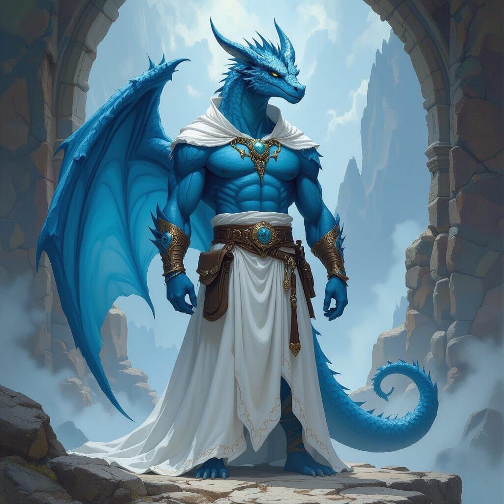 A majestic blue dragonkin cleric wearing holy amulet and clerical robes. The image is reminiscent of fantasy art, conveying a sense of mystical realism and atmosphere.