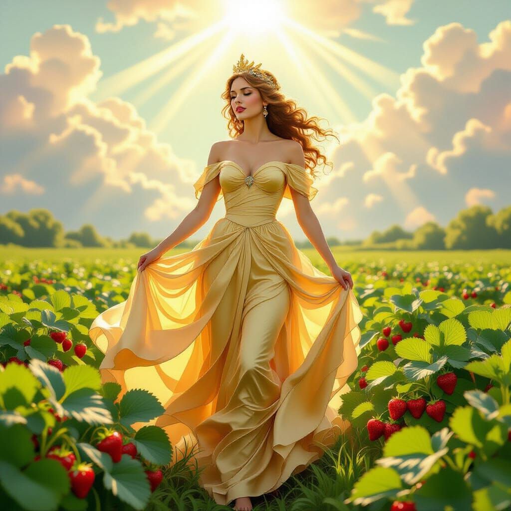 This image shows a beautiful queen in a golden gown standing in a strawberry field. The artwork is reminiscent of art nouveau with divine lighting and a soft, bright focus.