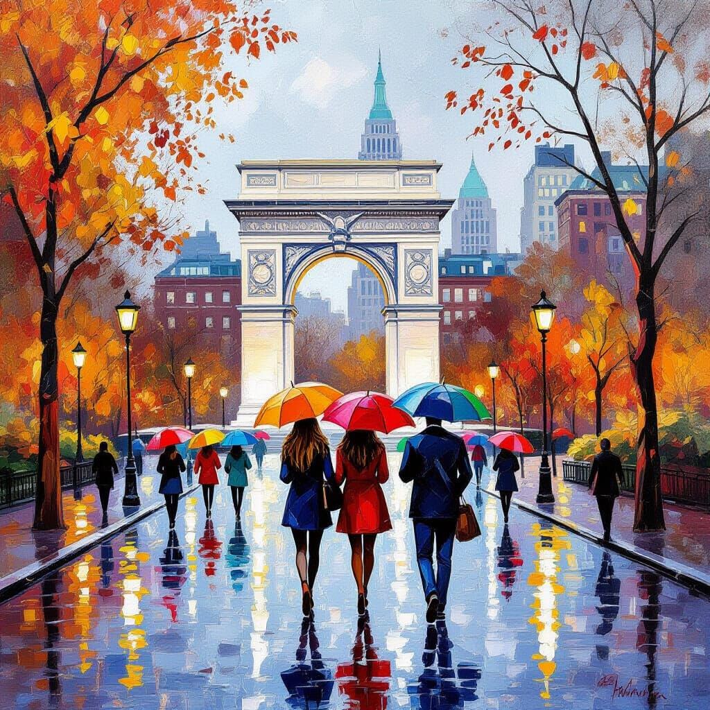 This image shows a romantic scene in Washington Square Park on a rainy autumn evening. Passers-by with umbrellas stroll along a wet cobblestone street in an impressionistic style.