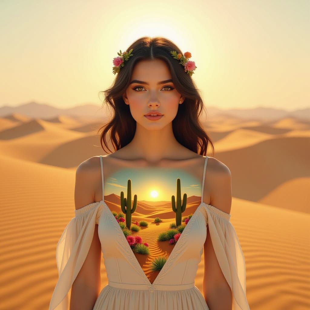 This image shows a young woman with a desert oasis inside her chest. The artwork is reminiscent of pre-Raphaelite paintings, using soft lighting and detailed brushwork to create a surreal yet serene atmosphere.