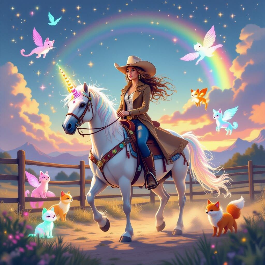 This image shows a brave cowgirl riding a glowing unicorn, guiding magical animals like flying cats and tiny dragons into a corral under a fairytale sky. Rendered with vivid, luminous colors and a dreamlike atmosphere.