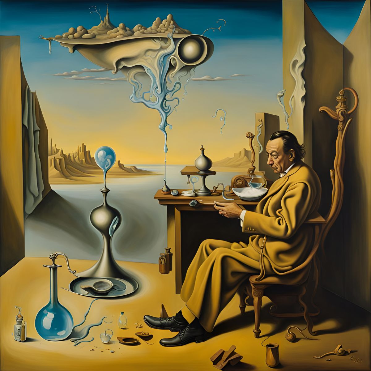 A surreal image of an alchemist named Smith. The background is matte, and the style evokes melting oil on canvas, reminiscent of Salvador Dali's surrealism.