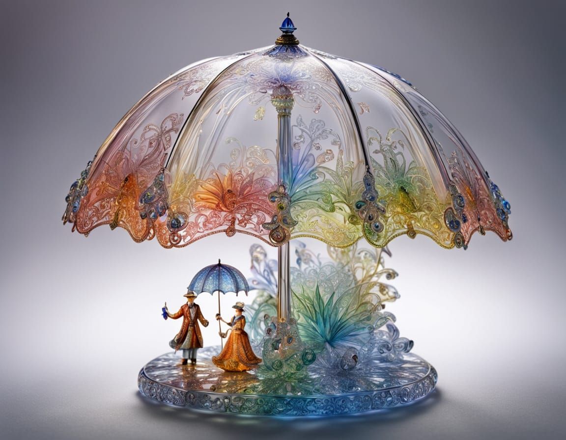 This image features a breathtaking, hyperdetailed figurine of an umbrella crafted from transparent, shiny blown glass. Shot with sharp focus and high contrast, it showcases intricate details and a luminous quality.