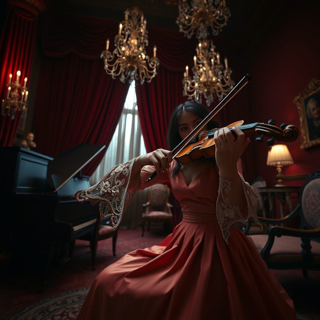 This image captures the precise moment a violinist's fingers touch the strings, echoing through a grand, crimson-red room with vintage furniture and a velvet curtain. The camera's low angle emphasizes the drama, with intricate lace patterns and a flowing silk skirt, reminiscent of Beksiński's realism and...